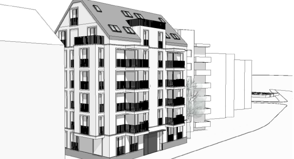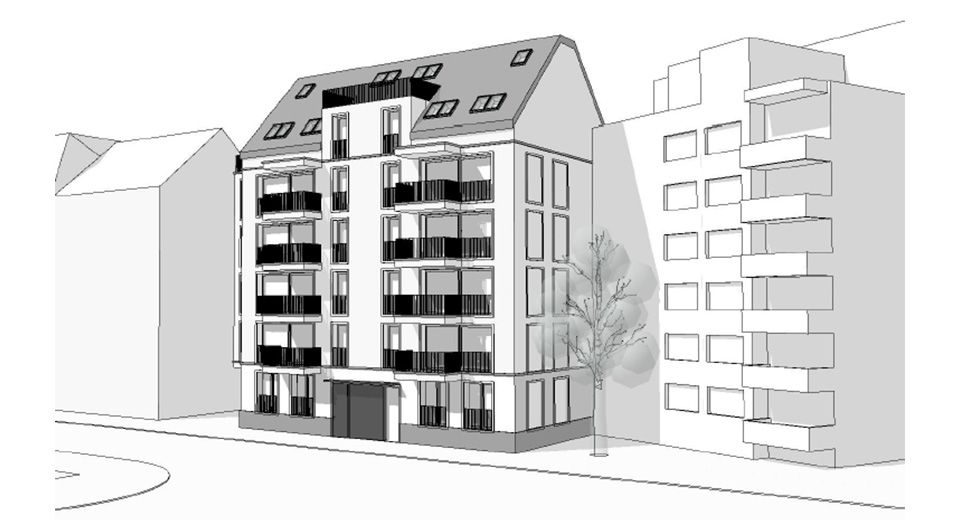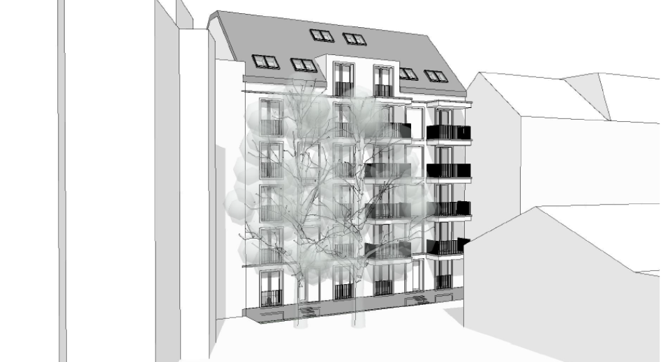 Ausgehend vom Bestand übernimmt der Neubau nahezu den identischen Fussabdruck und greift das für das Quartier typische Hochparterre wieder auf. Die Wohnungen erhalten sowohl strassen- als auch hofseitig auskragende Aussenräume. Diese Bauteile sind in klassischer Achsensymmetrie an den beiden Längsfassaden angeordnet und nehmen damit Bezug auf die traditionelle Fassadengliederung.